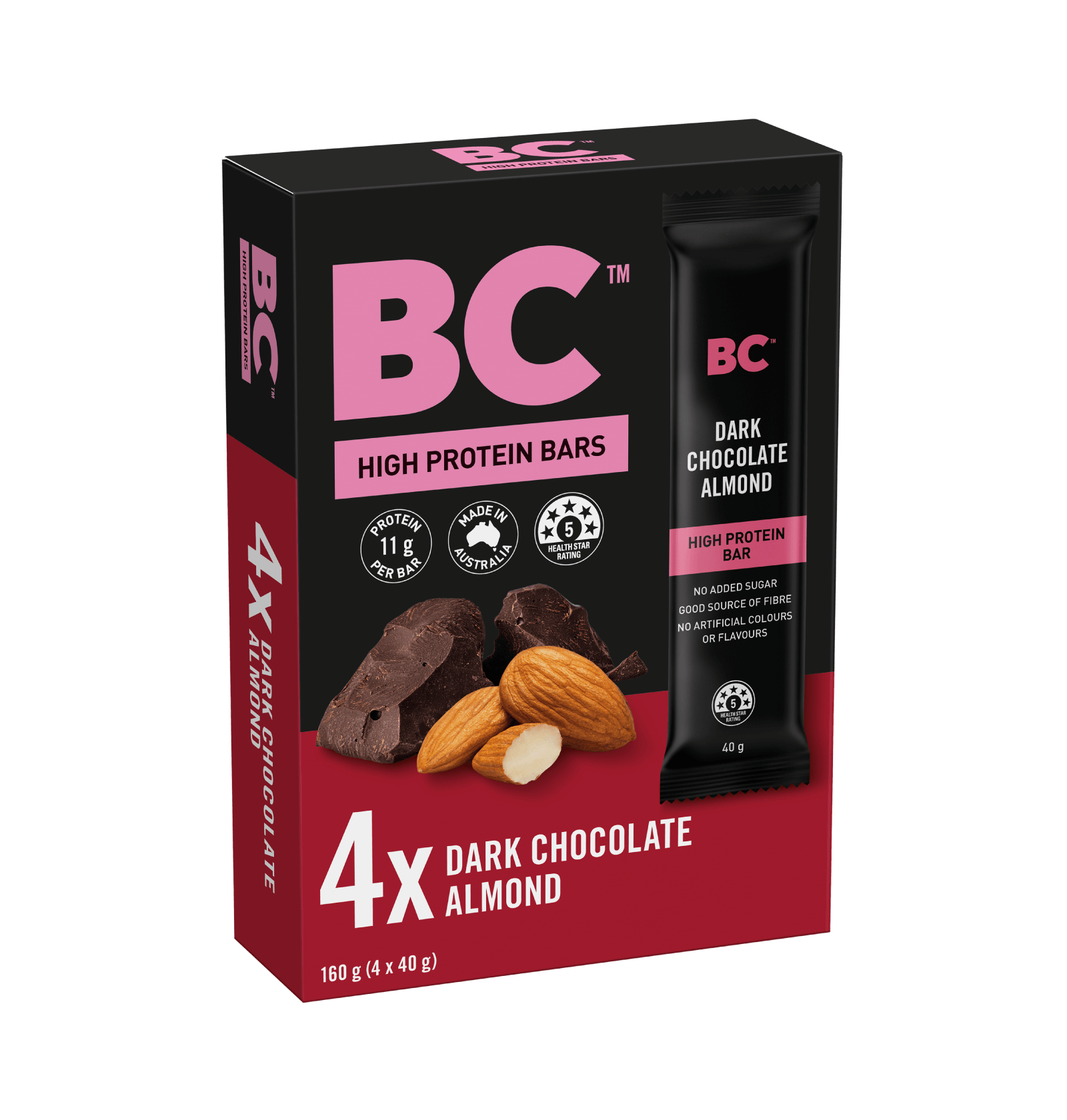 A high protein bar made from premium ingredients enrobed in dark chocolate.